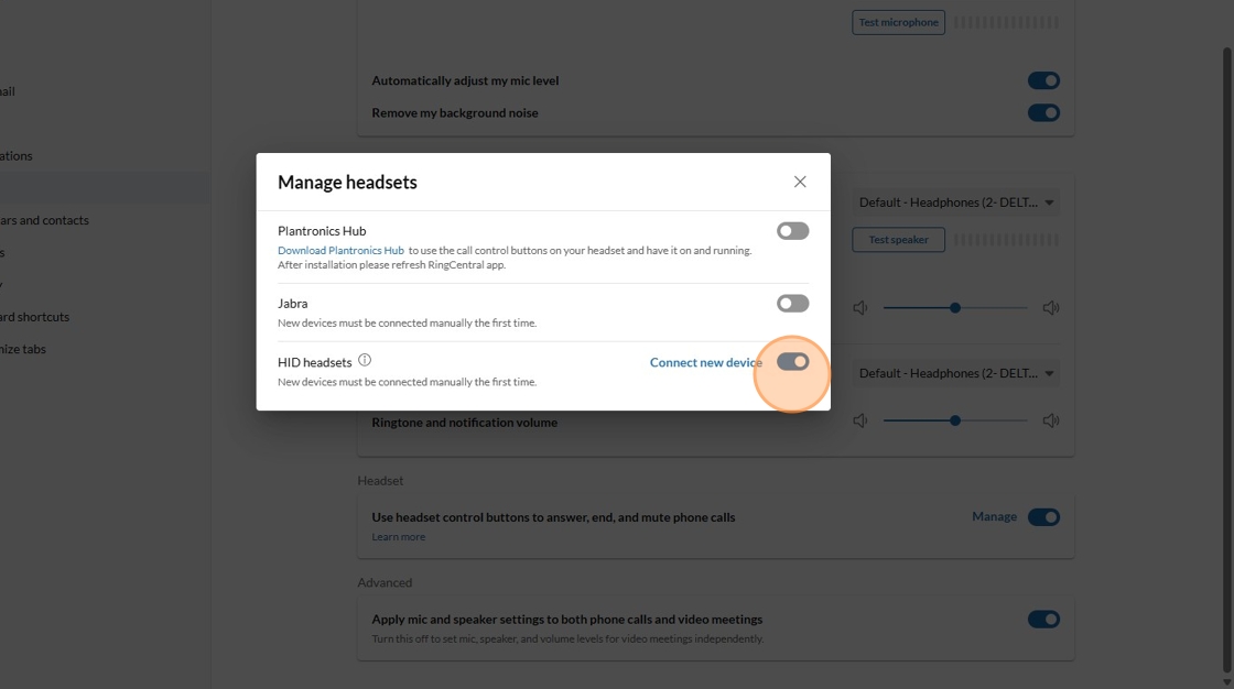 9. Ensure "HID Headsets" is toggled on